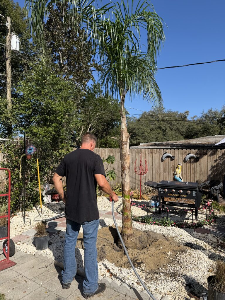 Forget the sprinklers! For the first two weeks, your new palm needs a daily deep soak. We recommend a slow trickle from a garden hose at the base for 15–20 minutes. This ensures water reaches the bottom of the root ball, not just the surface rocks. check out how to ensure if your soil have enought water